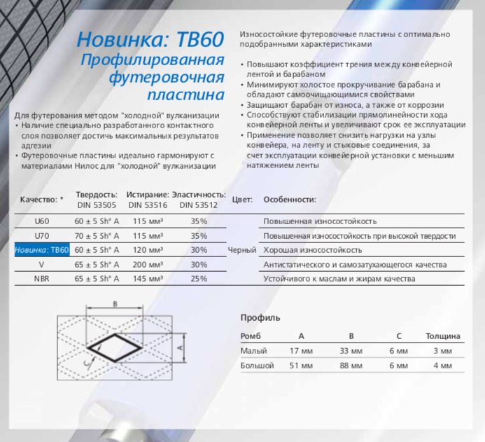 Также в нашем каталоге появилась профилированная гуммировочная резина TB60, которая прекрасно подходит для футерования методом