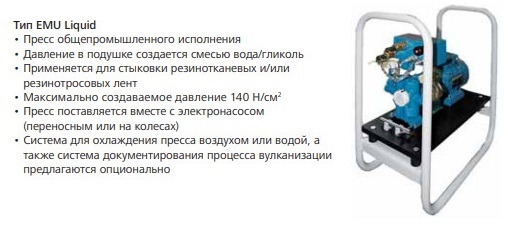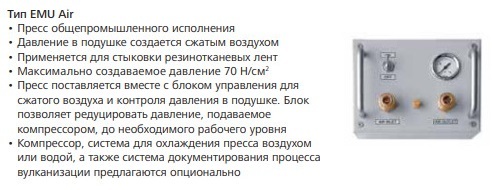 Пресс для вулканизации типа EMU – оборудование общепромышленного исполнения, в основе работы которого лежит сочетание двух систем: создания температуры (на основе силиконового нагревательного элемента) и создания давления (на основе резиновой подушки давления).